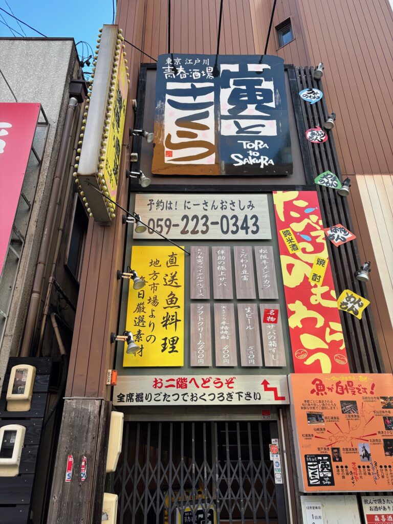 写真1は、津駅を出てすぐの信号を右(南)へ。100mほど行ったところの左手にあるおみせ「寅とさくら」です。建物の2階にあるのですが、県下の漁港から取れたての魚を出してくれ、お値段も手ごろなお店です。