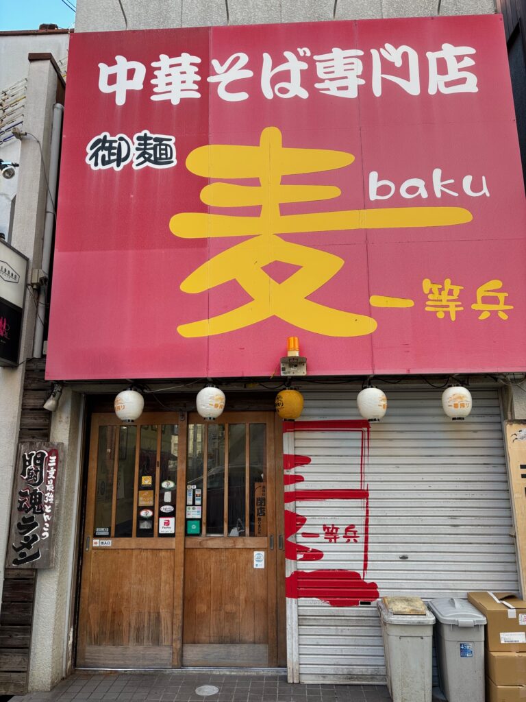 写真2は、そのお隣(津駅寄り)にある「麦(ばく)一等兵」。変な名前ですがラーメン主体の中華屋さんです。お昼はラーメン主体で、夜は中華をあてに一杯飲もうという感じですね。名物は闘魂ラーメン。若い人向けの濃い味付けです。血圧を気にする人には向かないかも。