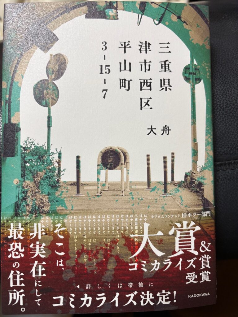 二つ目は本の話です。今年1月にKADOKAWAから「三重県津市西区平山町3-15-7」という本が出版されました(写真2)。著者は大舟という人で、筆者は初めて知る作家です。分野としてはホラー系ライトノベルですね。もちろん、こんな町名は津市にはないので、想像の世界の話なのですが、津市を取り上げてもらって少しは嬉しいかなと感じています。特に、登場人物の会話、それも「西区」とされているところの住民の会話が、違和感なく津ぅの話し方になっています。作者は方言をよく勉強したか、あるいは地元出身なのでしょうか。津の別所書店では販売直後から売り上げのトップを走っており、3月初旬の段階で再販がかかっています。さらにコミカライズもされるとのこと。津市民以外からどのように感じられるか、楽しみでもあり不安でもあります。